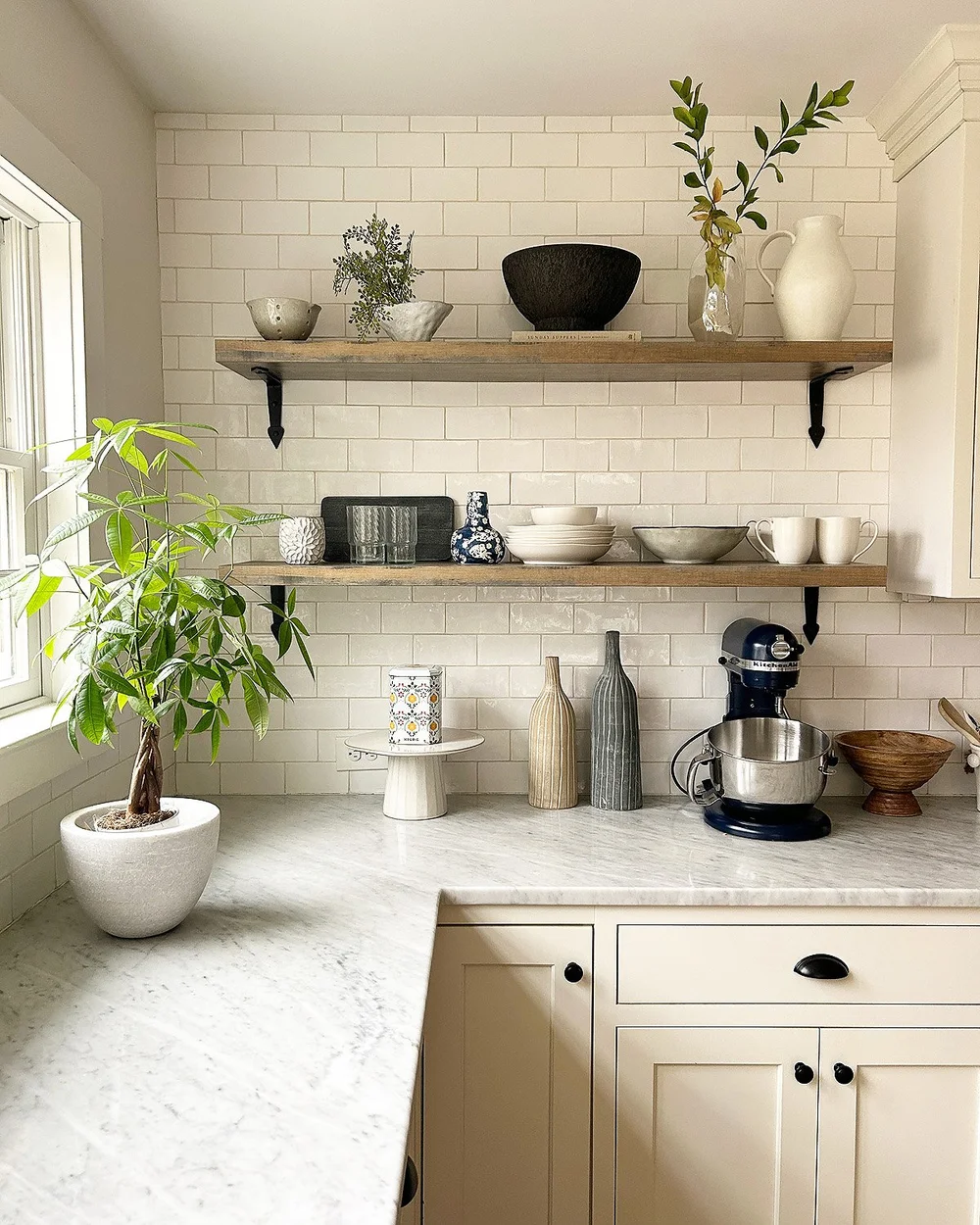 Neutral tones make the kitchen feel calm. Choose soft whites and grays. These colors blend well with other shades. They create a peaceful atmosphere. Neutral shelves highlight colorful items.